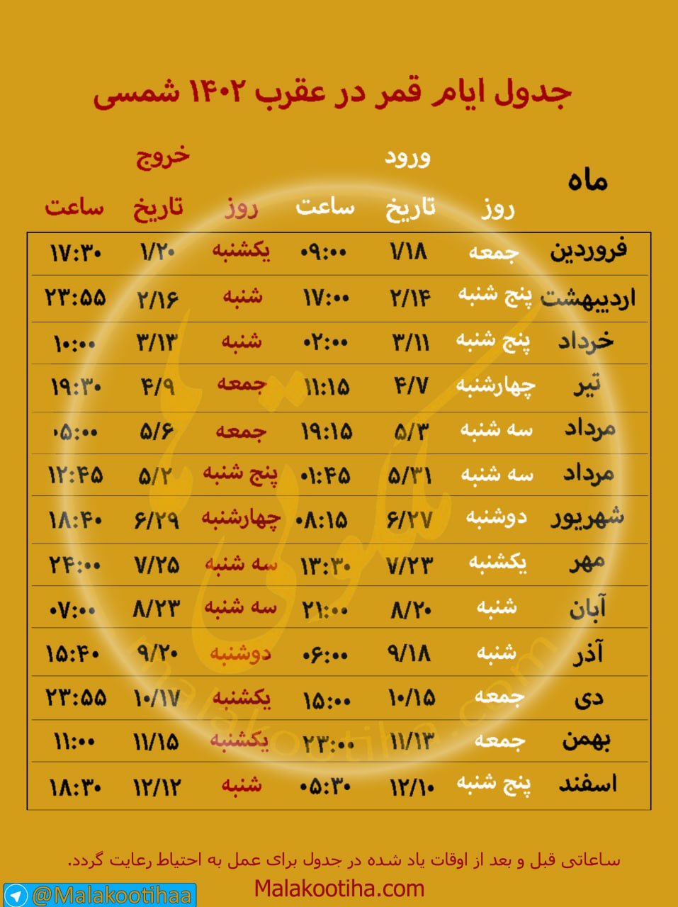 قمر در عقرب سال 1402,تقویم قمر در عقرب سال 1402,جدول کامل ایام قمر در عقرب سال 1402,روزهای قمر در عقرب سال 1402
